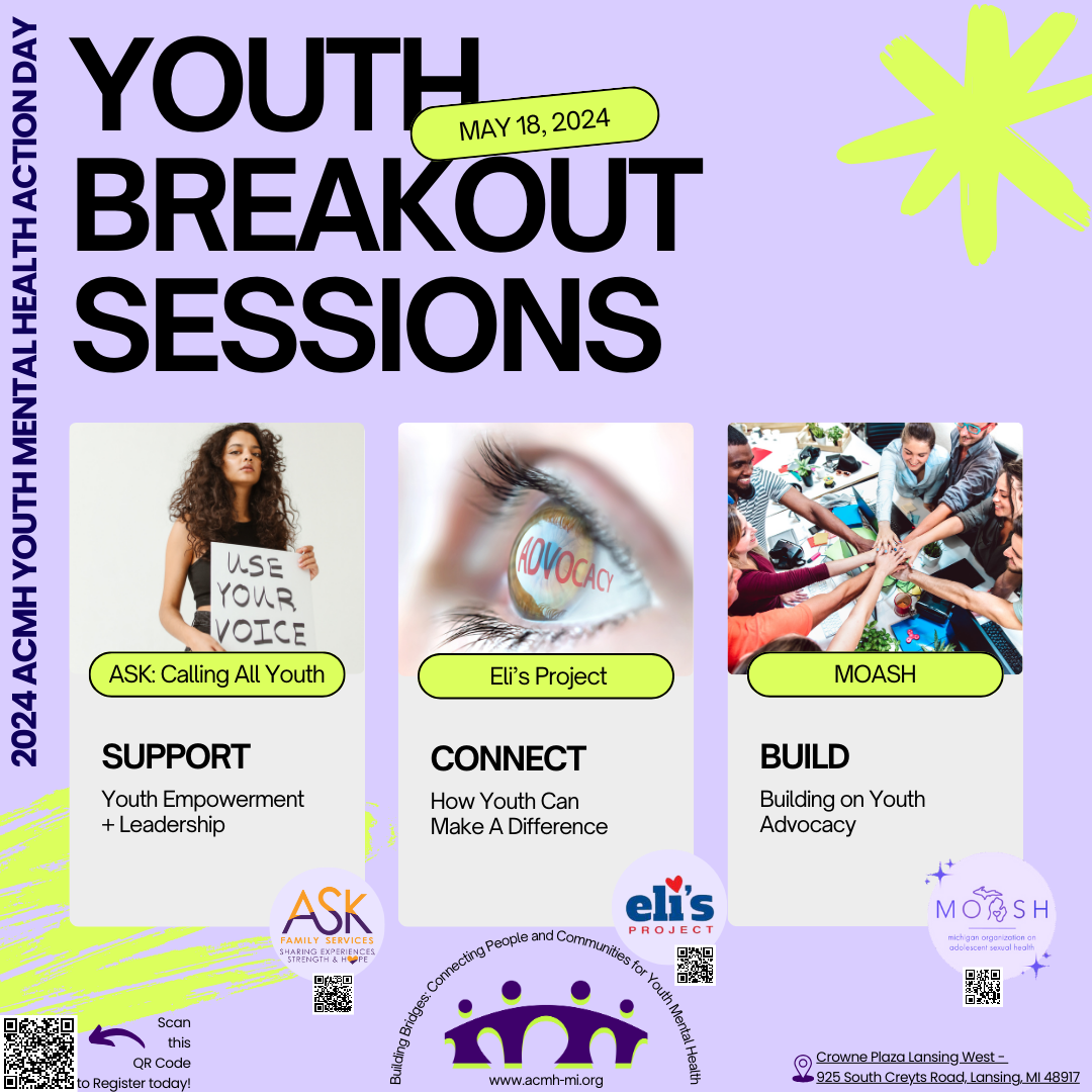 Please join ACMH, families, youth, young adults, community partners, peers, leaders and policymakers for the Association for Children’s Mental Health’s 2024 Youth Mental Health Action Day which will be held on Saturday, May 18th from 10:00 a.m. to 4:00 p.m. at Crowne Plaza Hotel in Lansing, MI.
