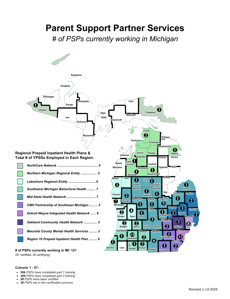 Michigan’s Parent Support Partner model is a statewide initiative in partnership with the Michigan Department of Health and Human Services that provides Medicaid reimbursable peer-to-peer parent support to eligible families as a part of Michigan’s Early Periodic Screening Diagnosis and Treatment State Plan.