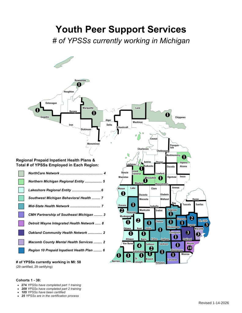 Michigan’s Youth Peer Support Model is a Statewide Initiative in partnership with the Michigan Department of Health and Human Services that provides Medicaid reimbursable Youth Peer Support to eligible youth as a part of Michigan’s Early Periodic Screening Diagnosis and Treatment State Plan.